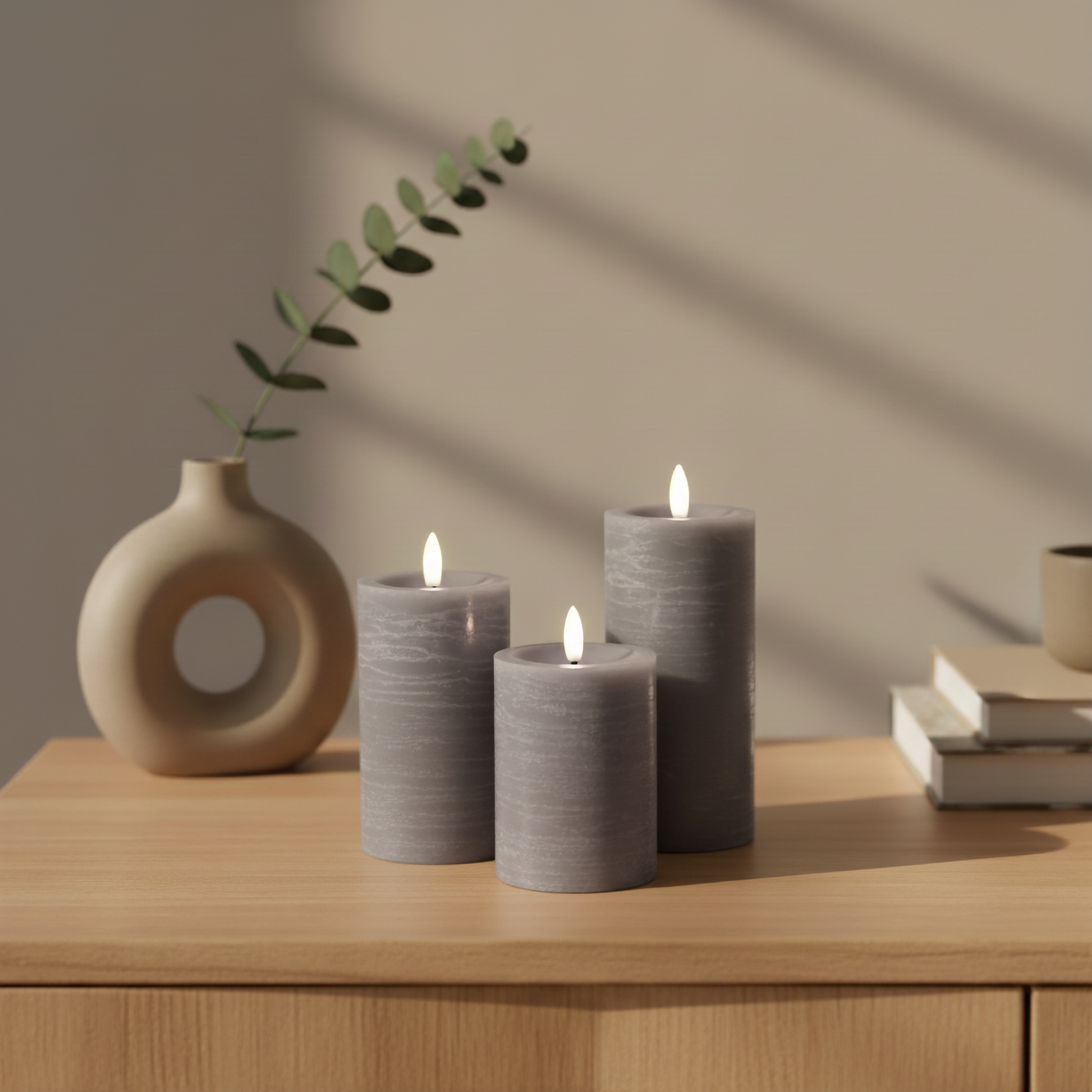 LED Stumpenkerzen Deluxe für den Innenbereich – 3er-Set in Grau