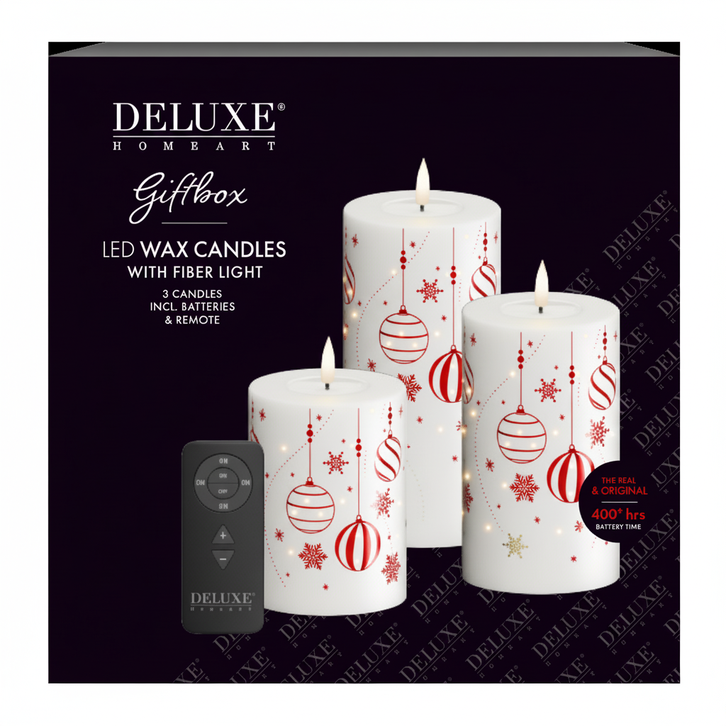 Deluxe Homeart LED Stumpenkerzen – Geschenkset mit 3 Kerzen (Rotmotiv) inkl. Fernbedienung und Batterien