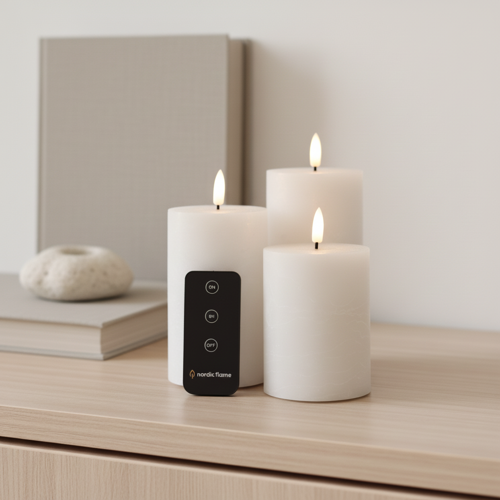 Entdecken Sie flammenlose LED-Kerzen von Nordic Flame – Realistische 3D-Flamme. 3er-Pack mit Fernbedienung und Timerfunktion. Schaffen Sie das ganze Jahr über Gemütlichkeit und Stil mit dänischem Design und hochwertiger Premium-Qualität.