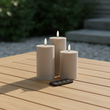 Elegantes Set mit drei sandfarbenen LED-kerzen, ideal für den Außenbereich. Perfekt für kleine Laternen, den Gartentisch oder eine gemütliche Outdoor-Atmosphäre.