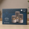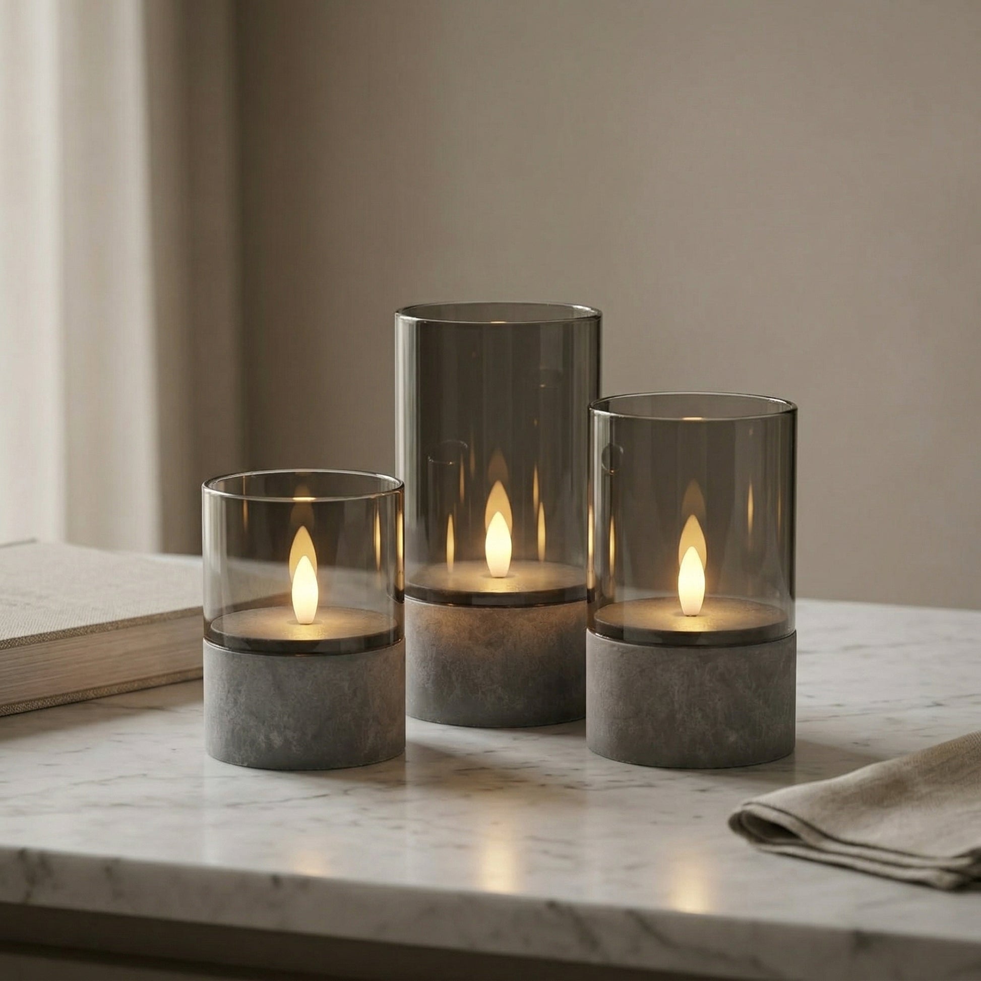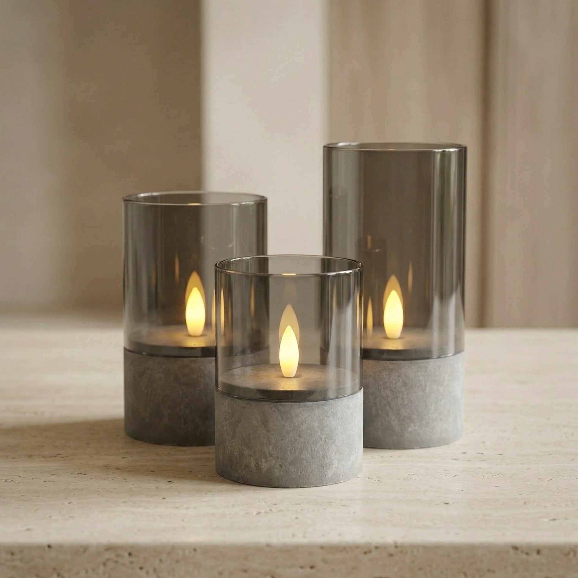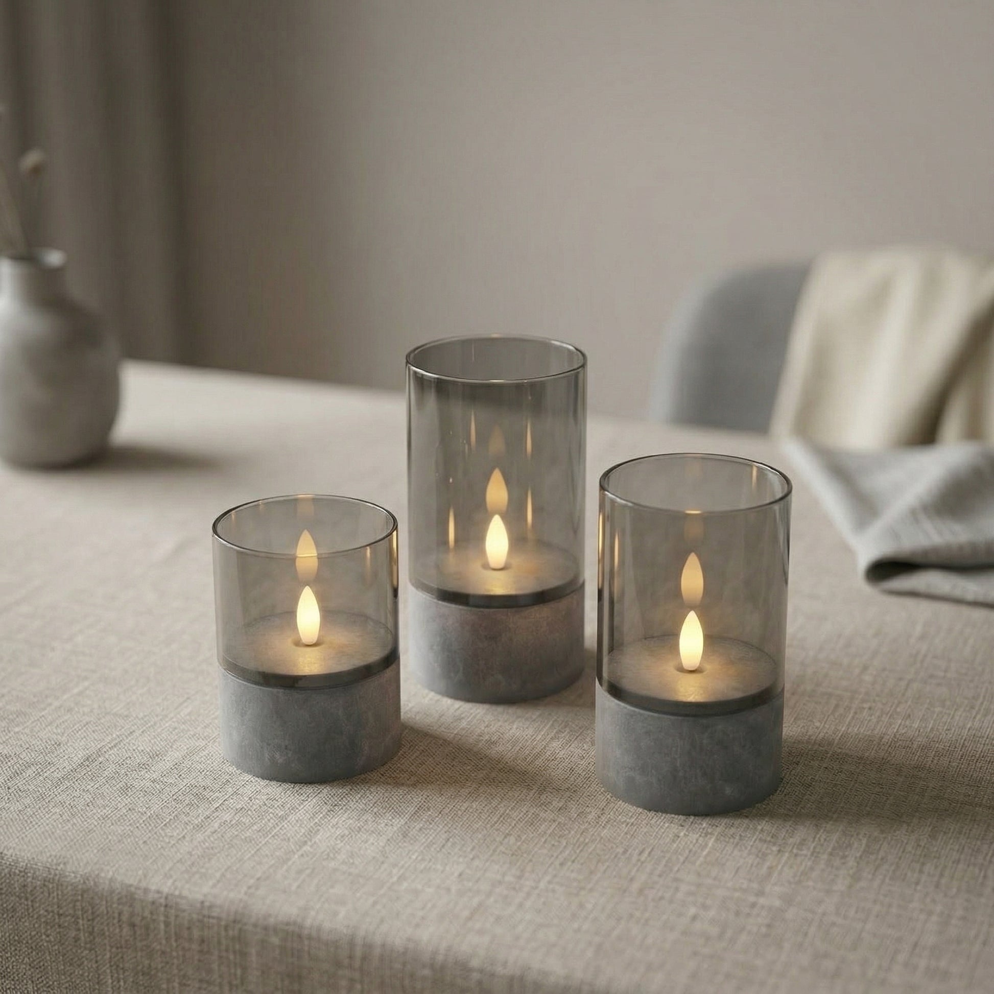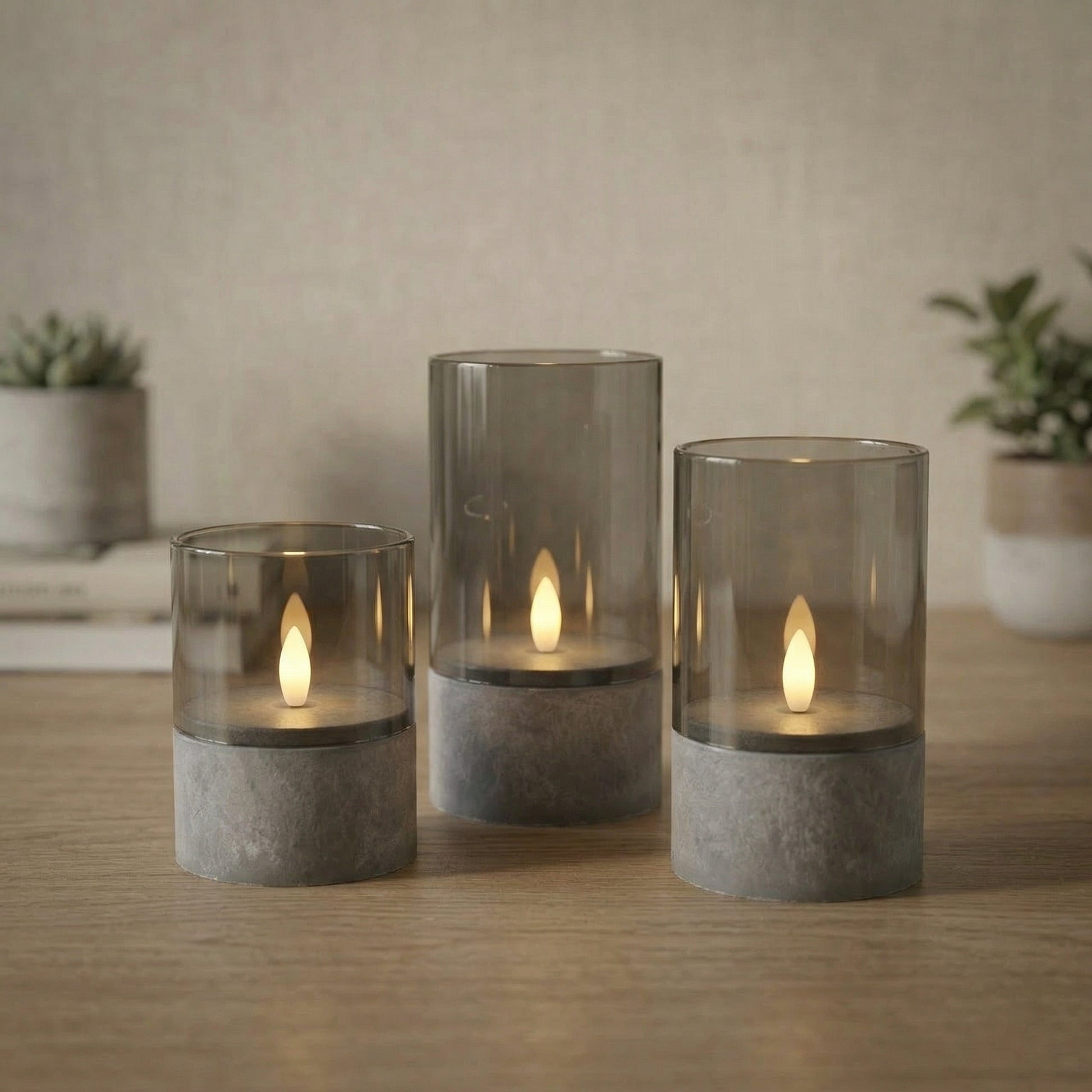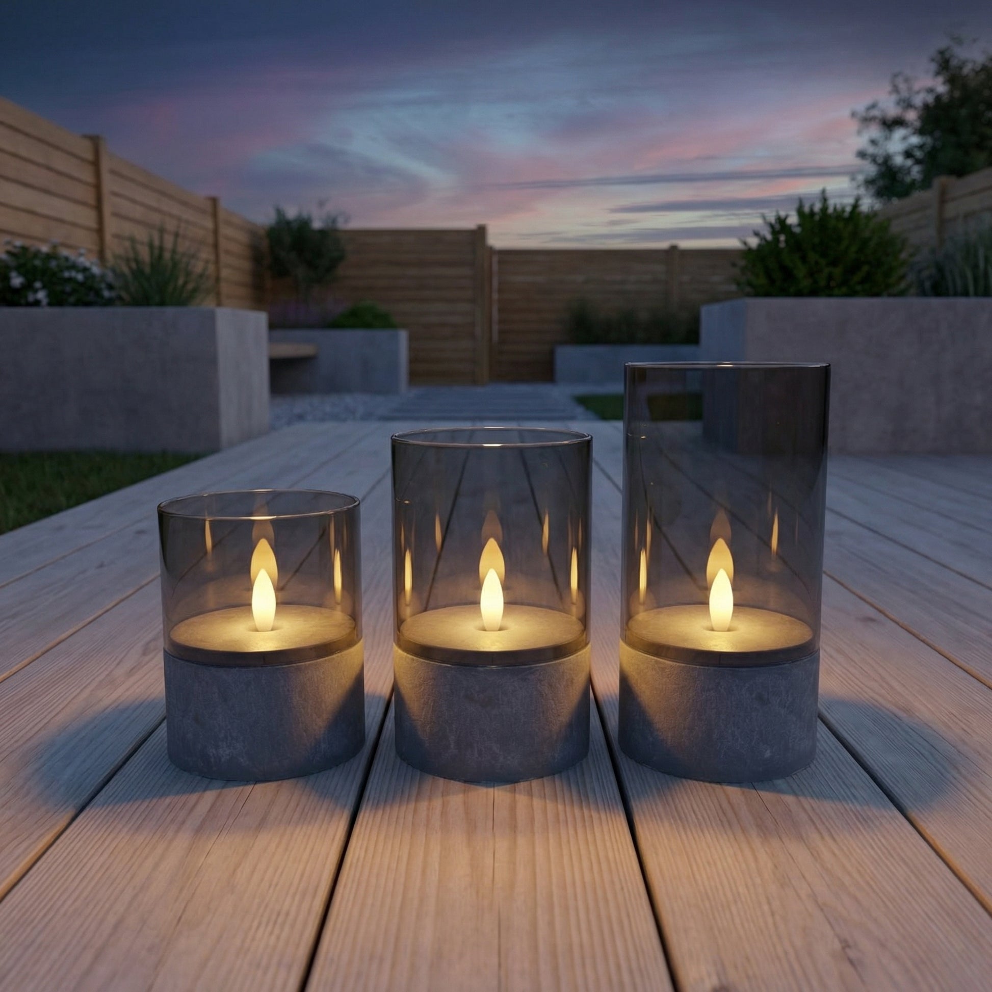 Outdoor LED-Kerzen mit Betonoptik & Rauchglas – 3er-Set | IP44 | 500 Stunden Batterielaufzeit