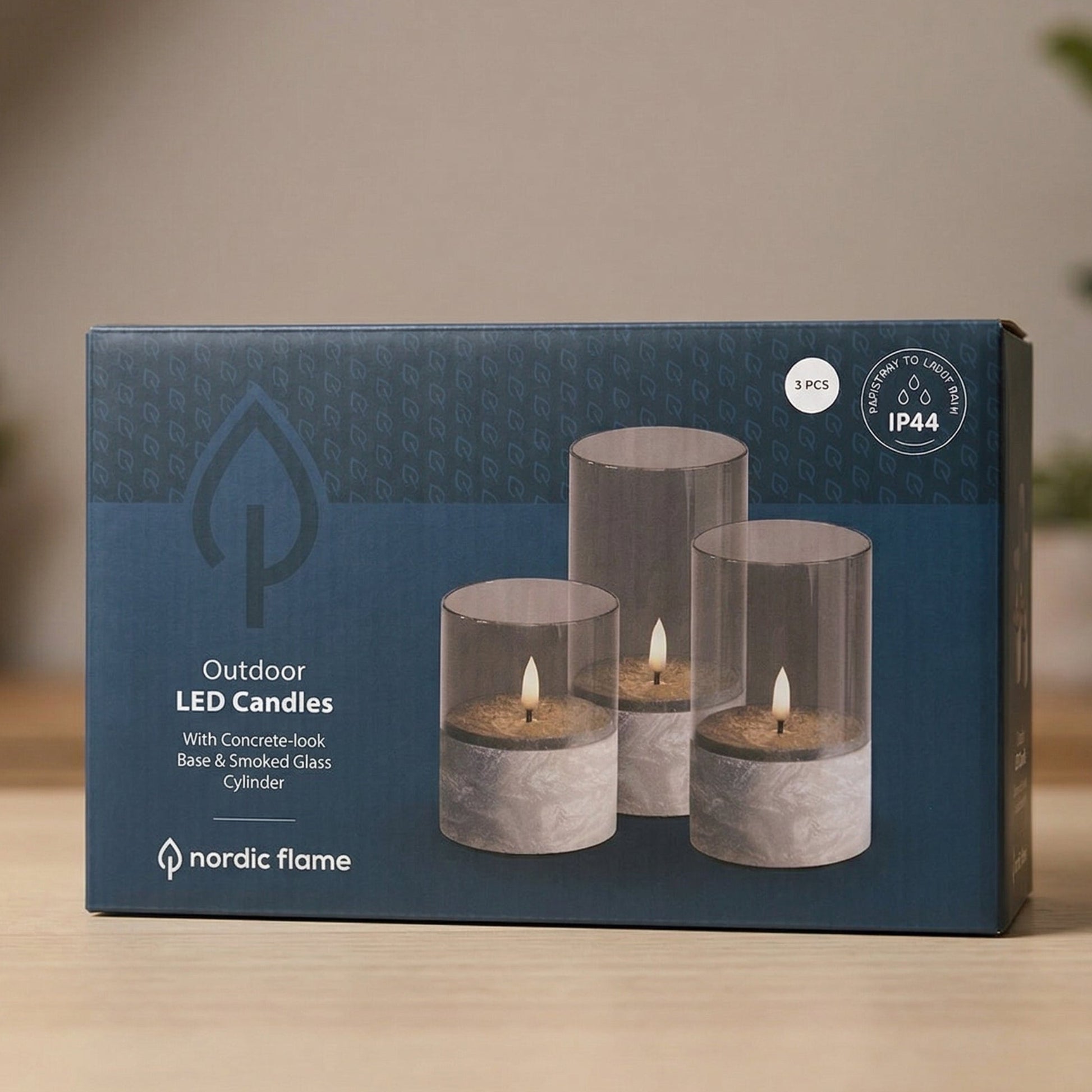 Schaffen Sie eine moderne und natürliche Atmosphäre – bei jedem Wetter – mit diesen Outdoor LED-Kerzen von Nordic Flame. Das Set enthält drei Kerzen in verschiedenen Höhen mit einer rohen Betonoptik-Basis und einem Rauchglaszylinder, der einen modernen und stilvollen Look verleiht. Perfekt für den Garten, die Terrasse, den Balkon – oder drinnen im Wohnzimmer.