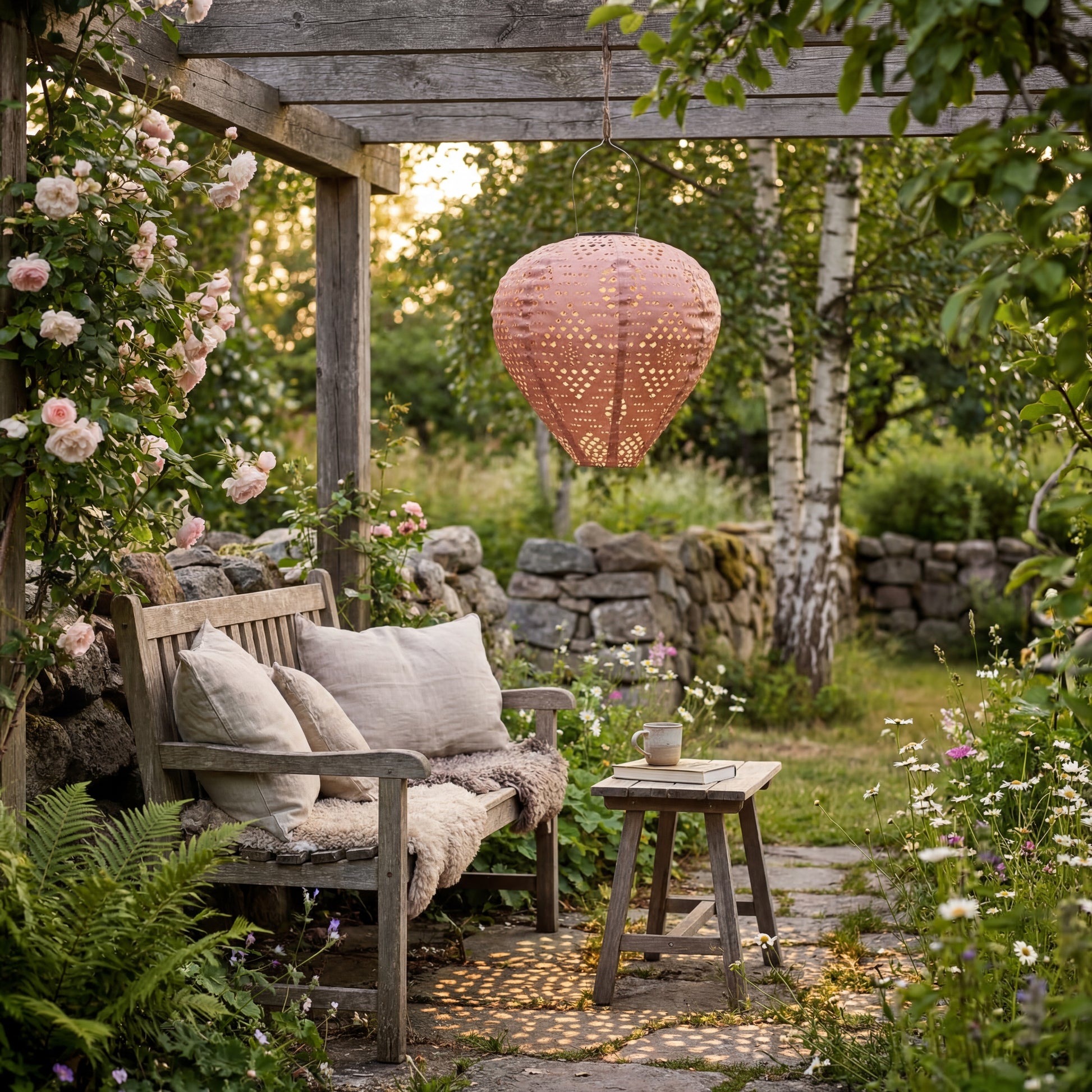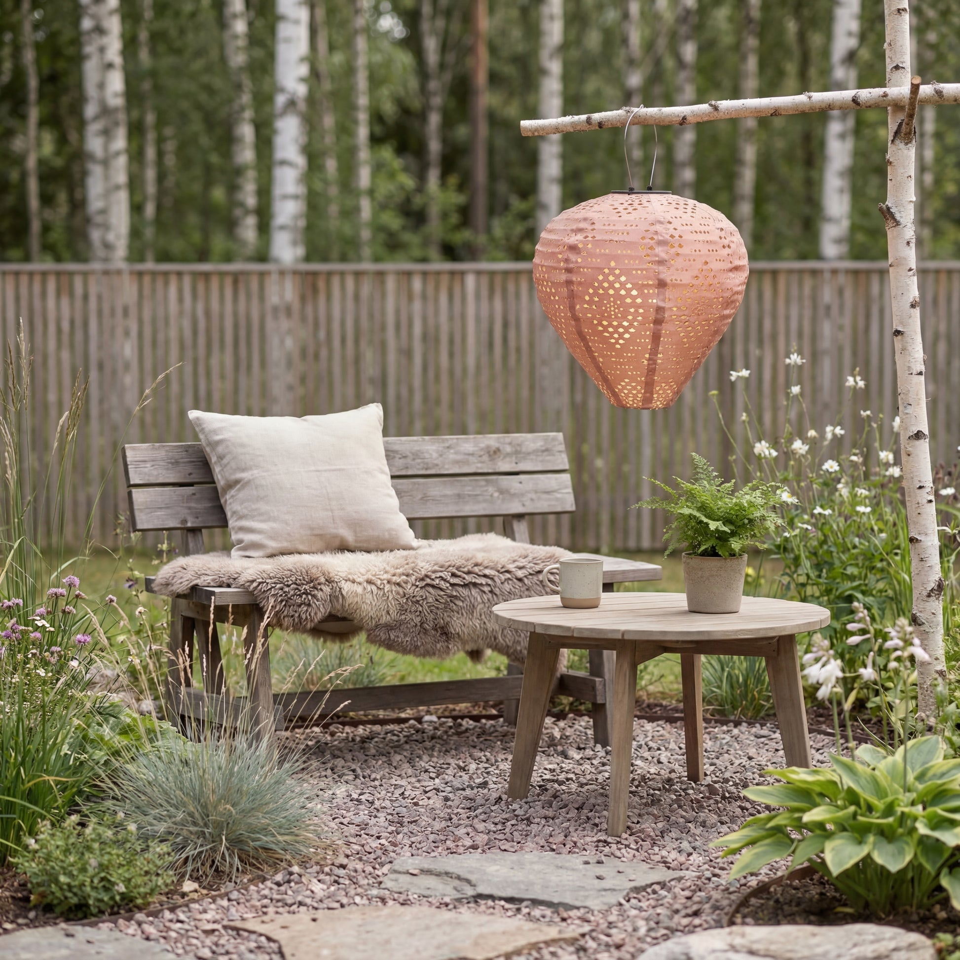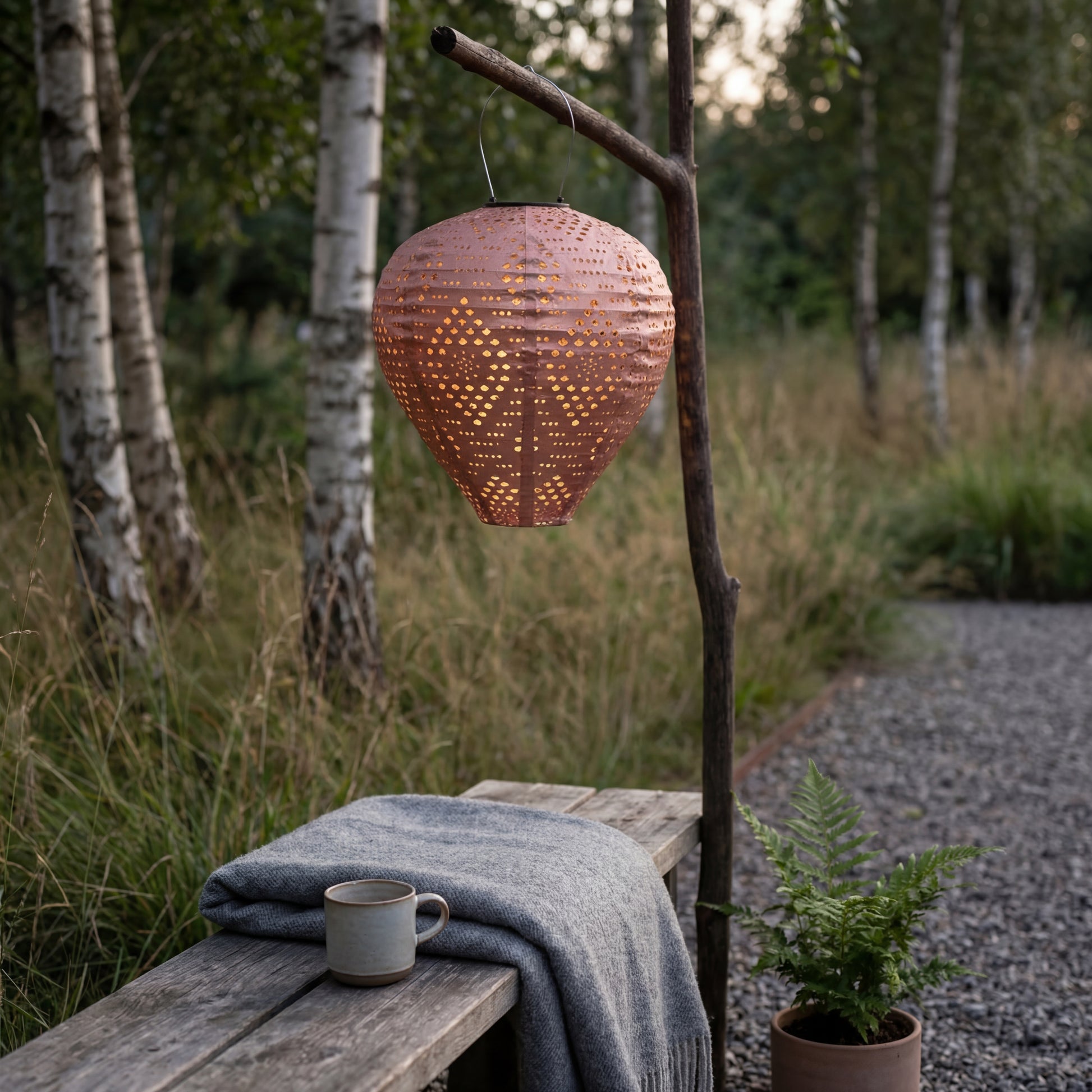 Die runde Form und die feinen perforierten Muster im Material erzeugen ein schönes Lichtspiel, wenn die Laterne eingeschaltet ist. Dadurch eignet sie sich perfekt als stimmungsvolle Beleuchtung für Sommerabende, Gartenfeste oder entspannte Momente auf der Terrasse.