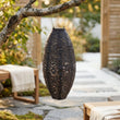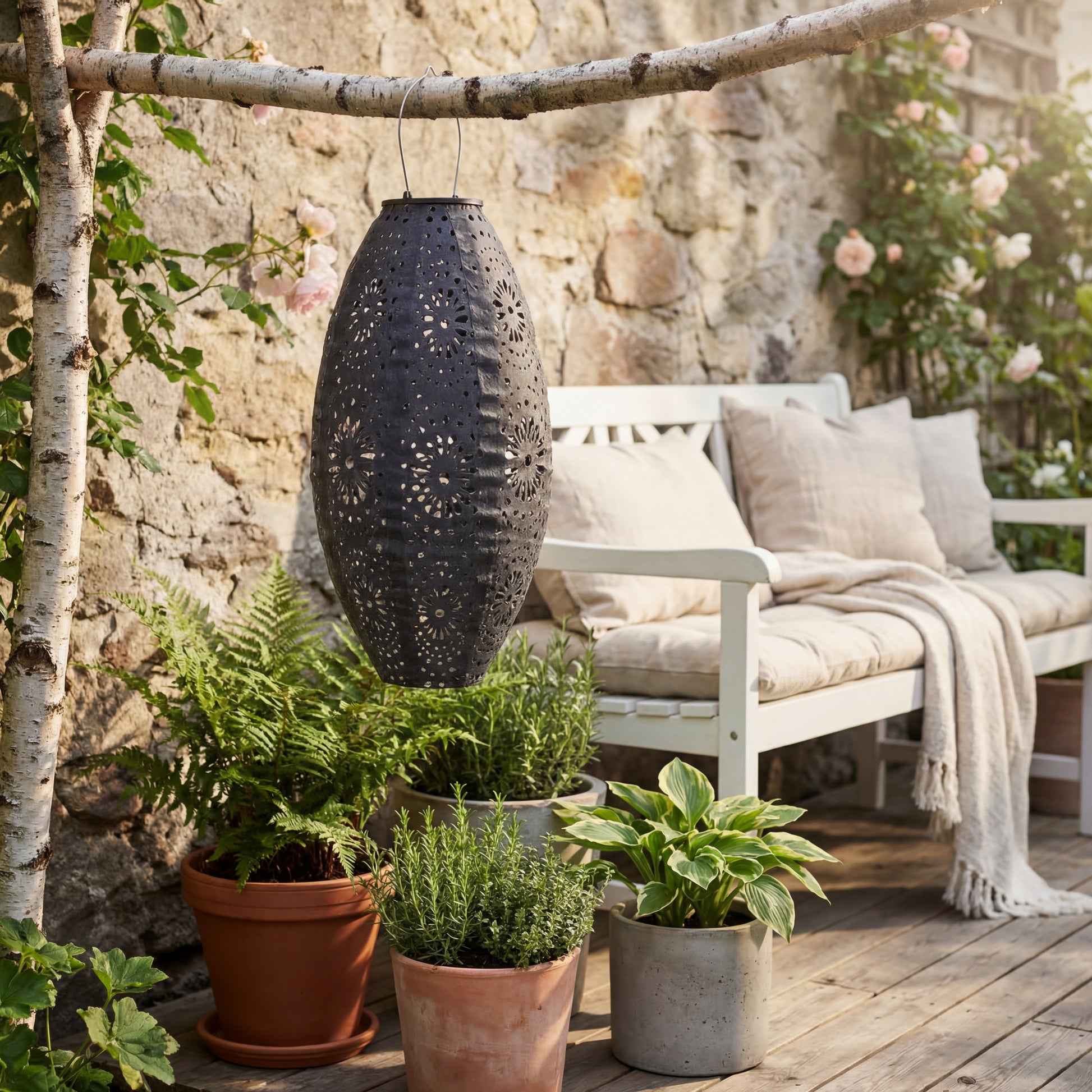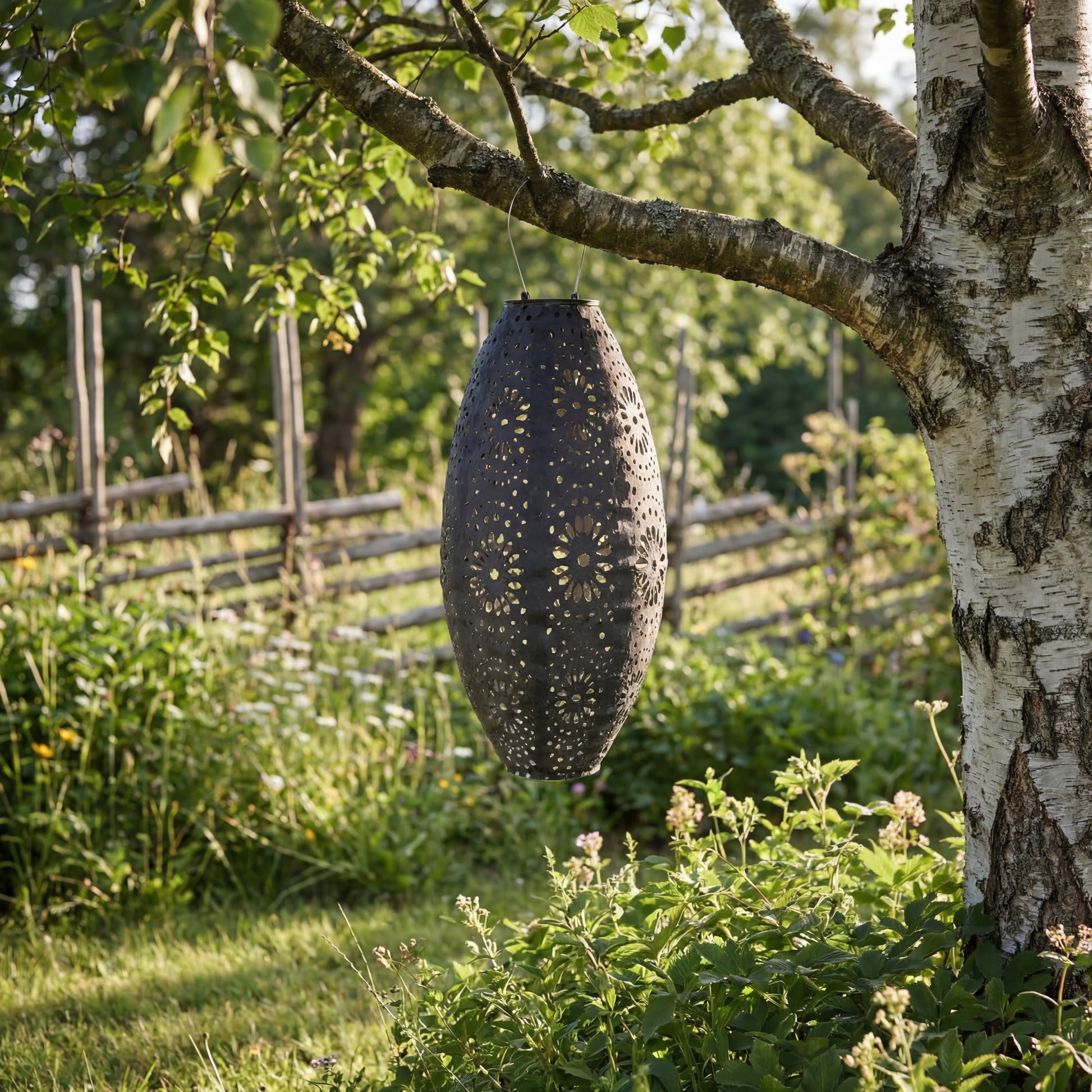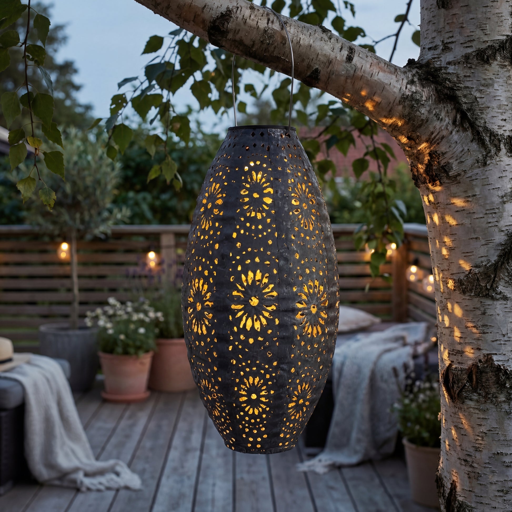 Die ovale Form und die dekorativen perforierten Muster im Metall erzeugen ein wunderschönes Lichtspiel, wenn die Lampe eingeschaltet ist. Dadurch eignet sich die Laterne perfekt als stimmungsvolle Beleuchtung für Sommerabende, Gartenfeste oder entspannte Momente auf der Terrasse.