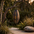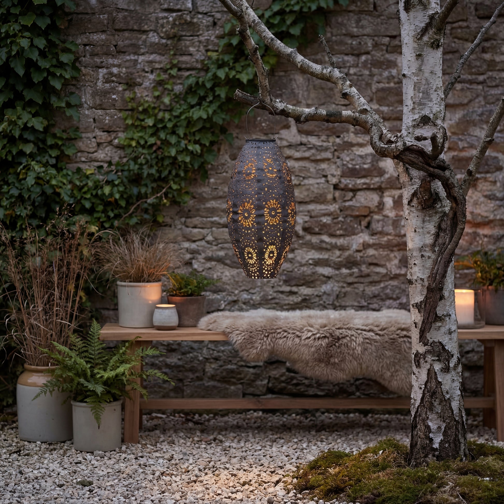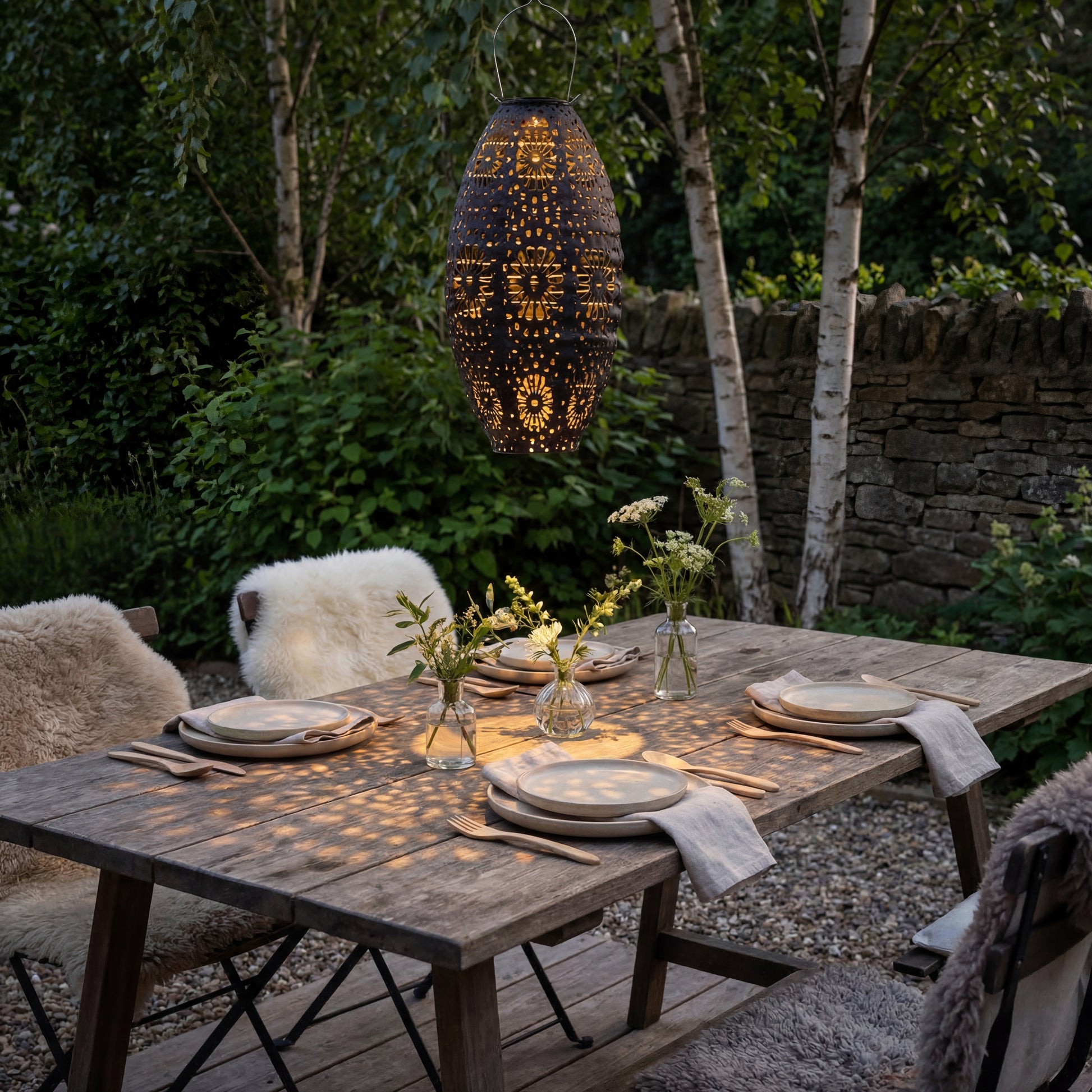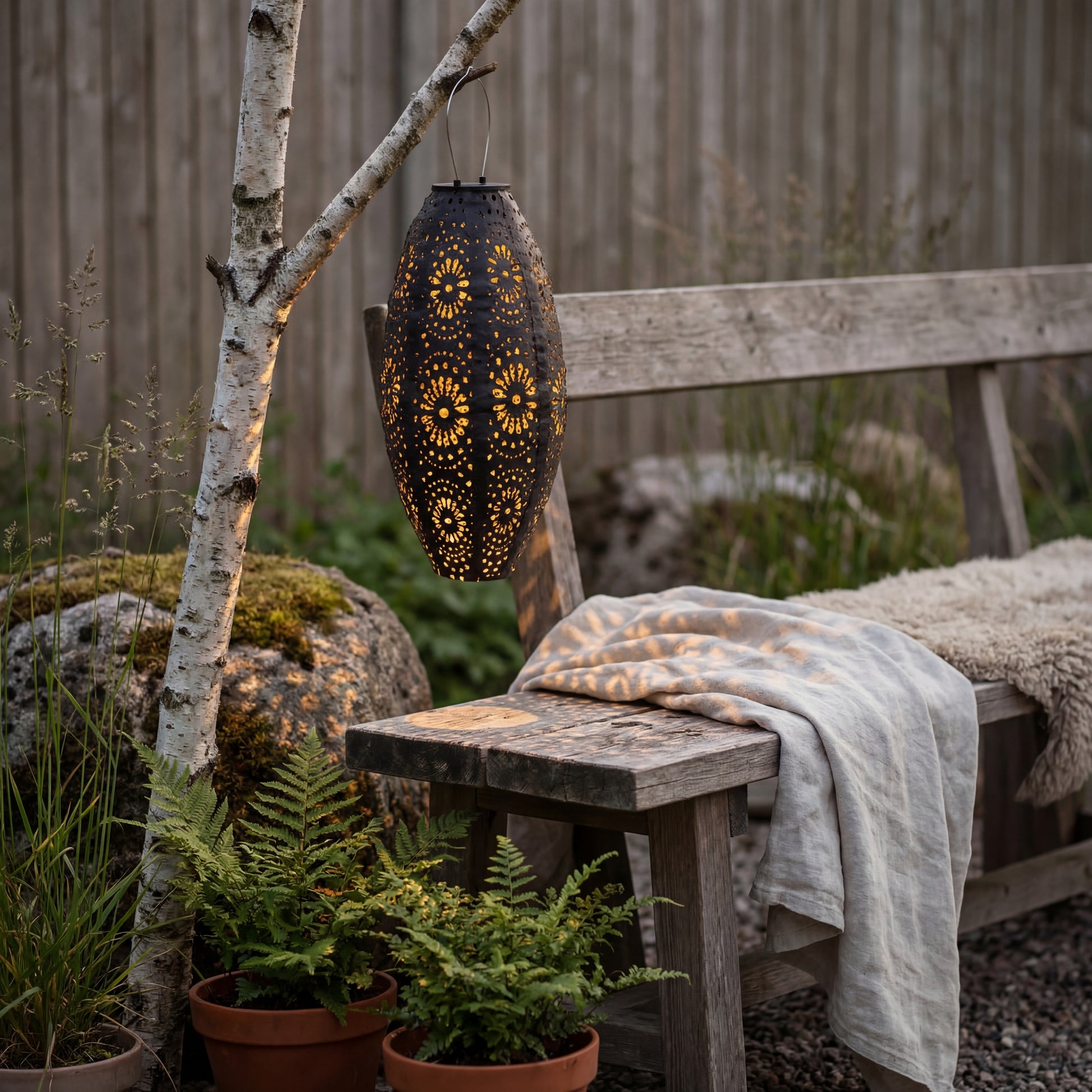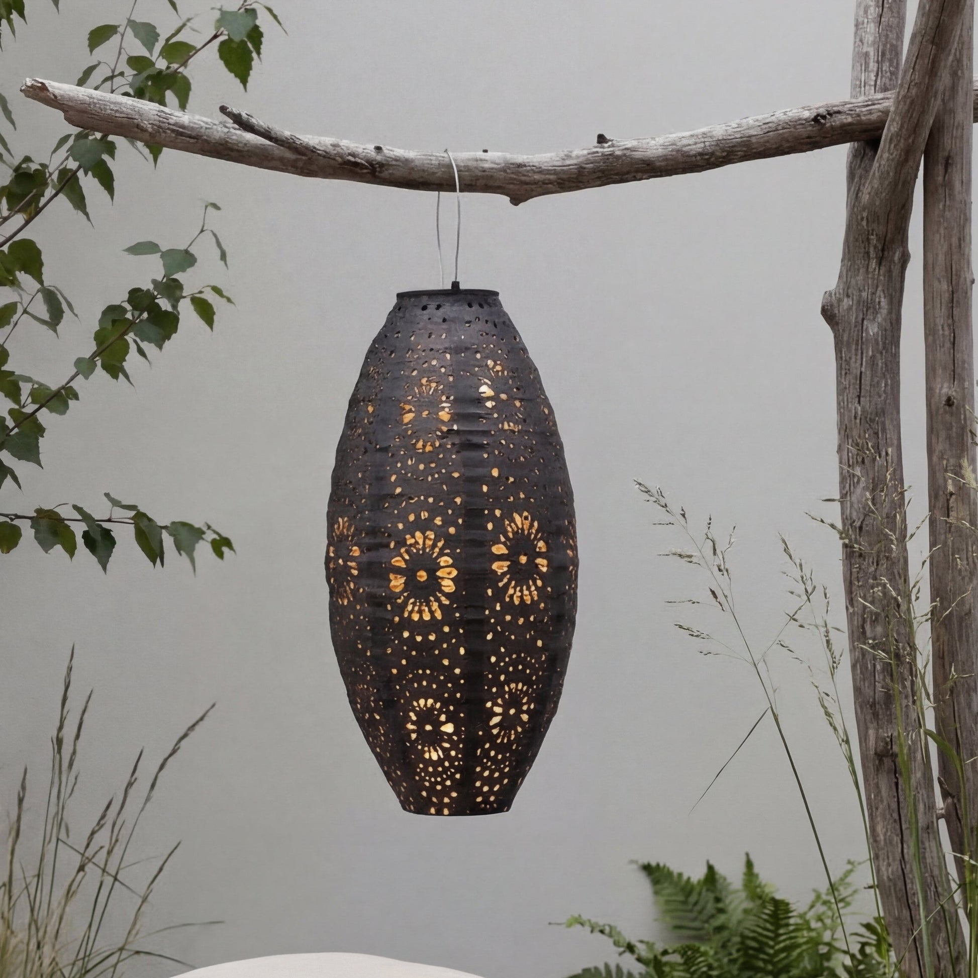 Die ovale Form und die dekorativen perforierten Muster im Metall erzeugen ein wunderschönes Lichtspiel, wenn die Lampe eingeschaltet ist. Dadurch eignet sich die Laterne perfekt als stimmungsvolle Beleuchtung für Sommerabende, Gartenfeste oder entspannte Momente auf der Terrasse.