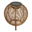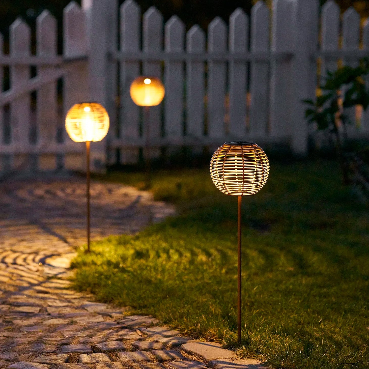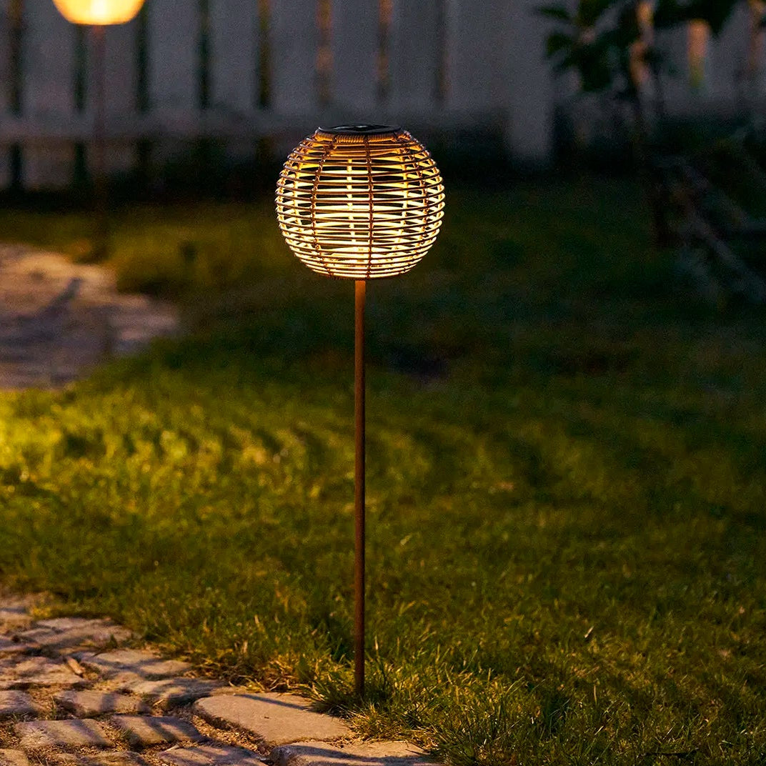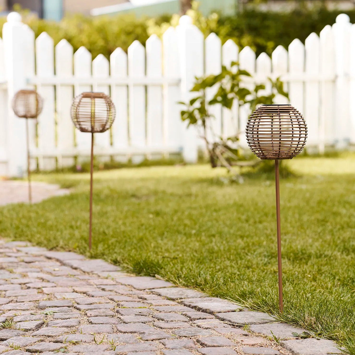 Der runde Lampenschirm im naturfarbenen Design sorgt für ein warmes und einladendes Licht, das eine gemütliche Stimmung im Garten schafft, sobald es dunkel wird. Die Lampe ist auf einem praktischen Erdspieß montiert, sodass sie einfach in den Boden entlang von Gartenwegen, in Blumenbeeten oder auf der Terrasse platziert werden kann.
